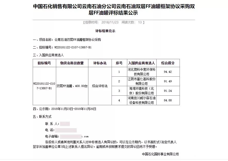 11月23日,中國石化銷售有限公司云南石油分公司對雙層FF油罐采購評標結果進行了公示,河北澳科中意環(huán)??萍加邢薰疽跃C合得分94.42的成績名列第一名,成為本次400臺FF雙層油罐的采購優(yōu)選候選人。